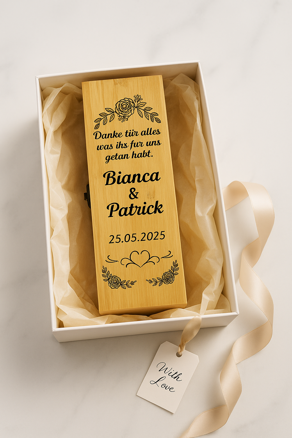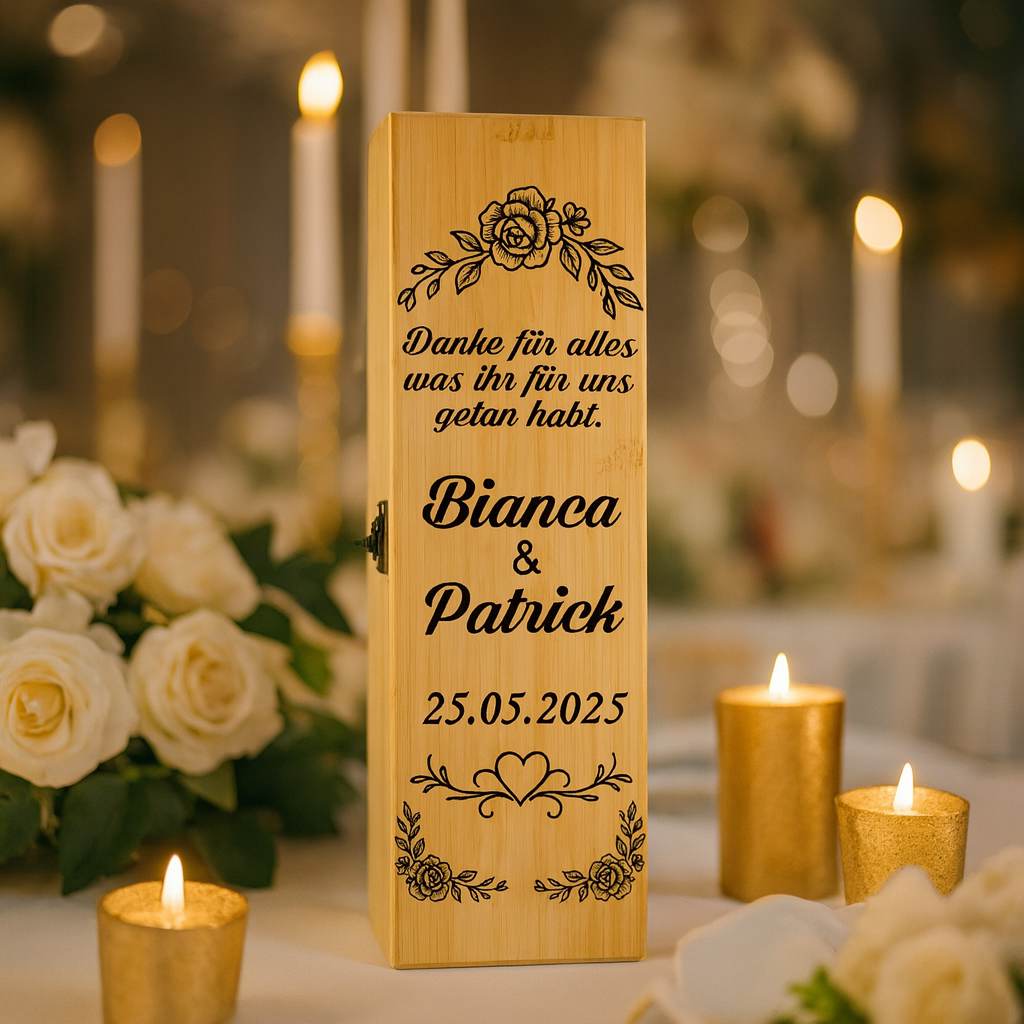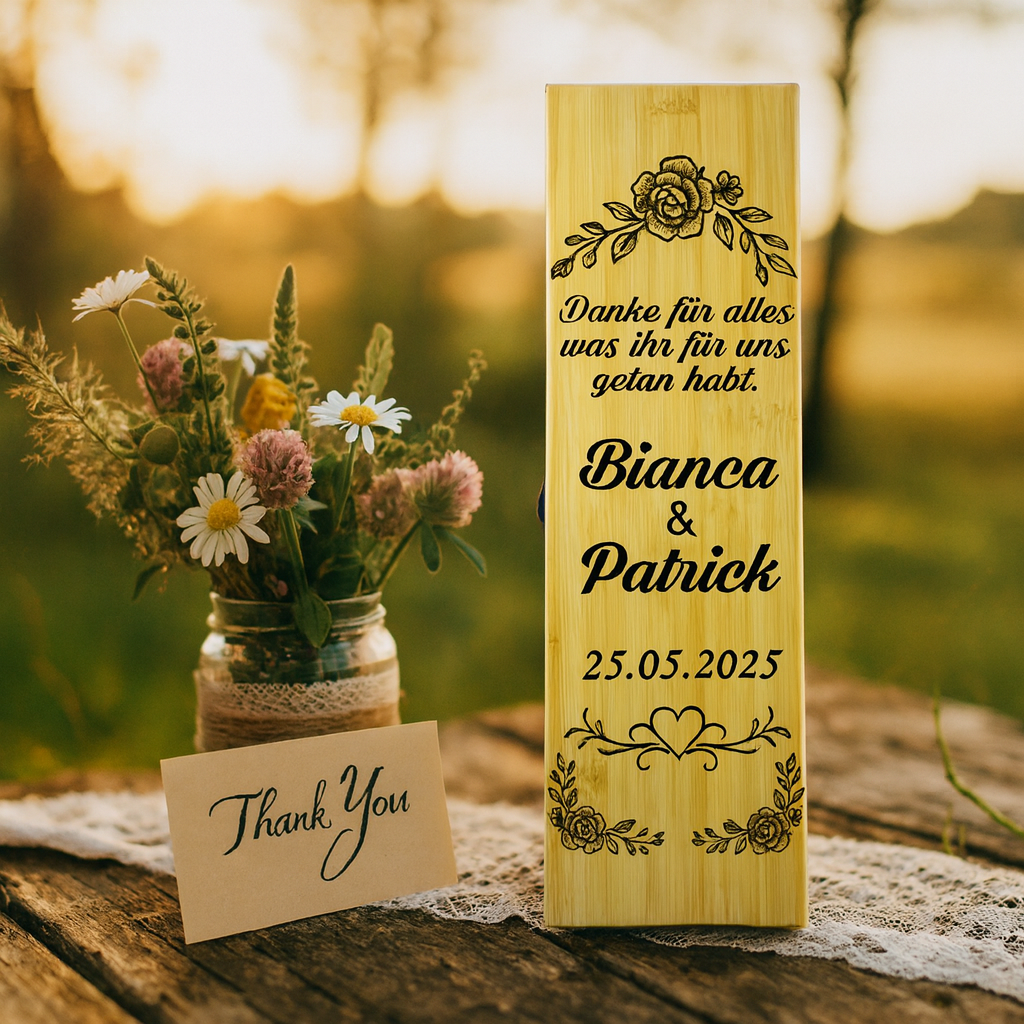 Diese edle Weinbox aus nachhaltigem Bambus ist das perfekte Hochzeitsgeschenk vom Brautpaar an die Eltern. Mit der Gravur eurer Namen, dem Hochzeitsdatum und einer persönlichen Botschaft wird sie zu einem einzigartigen Erinnerungsstück an euren großen Tag.