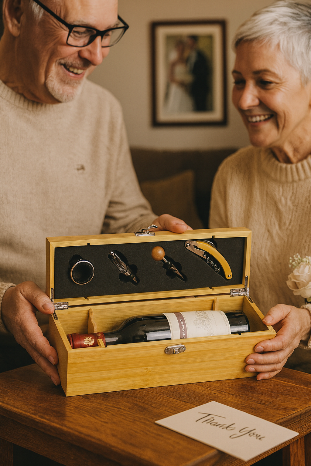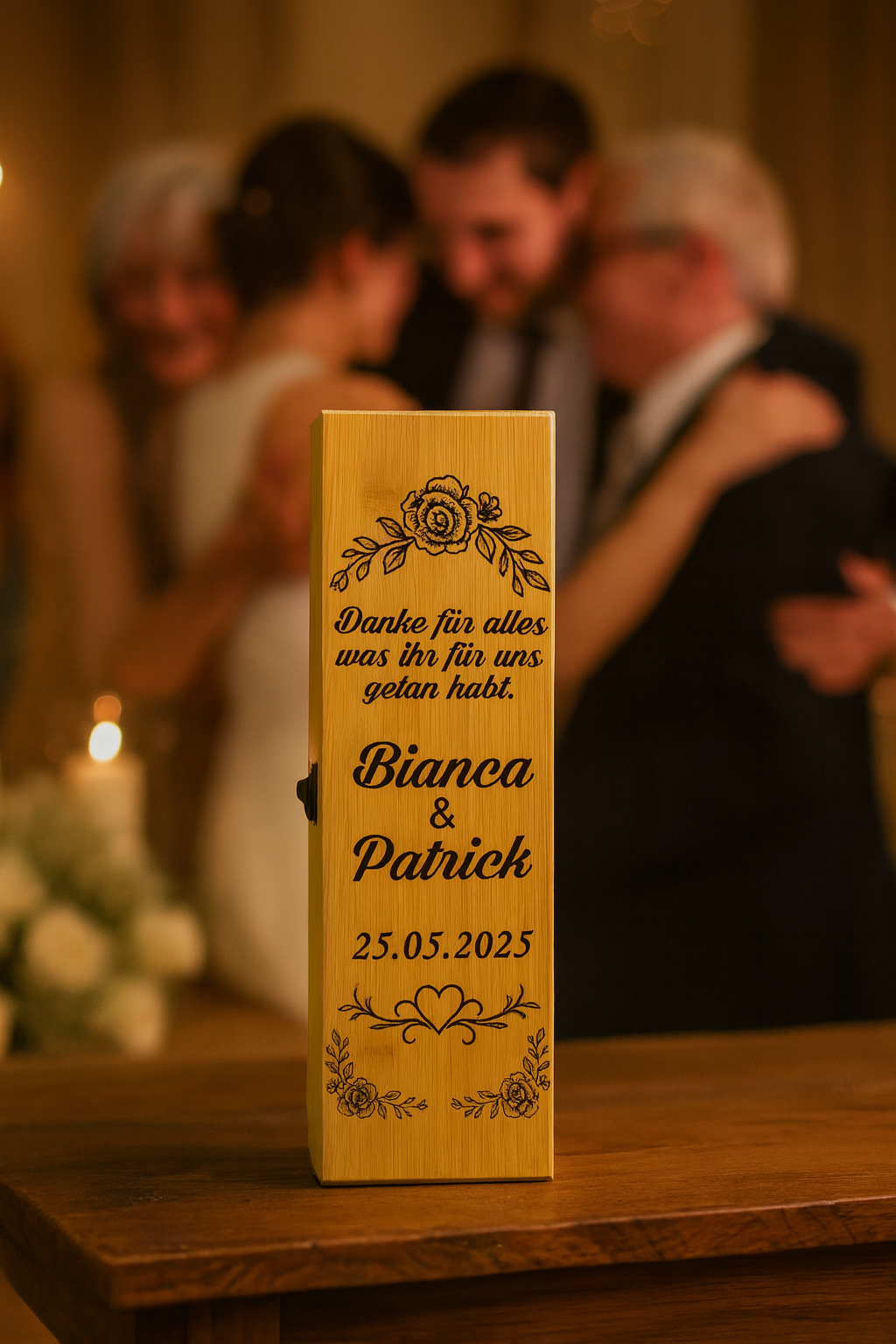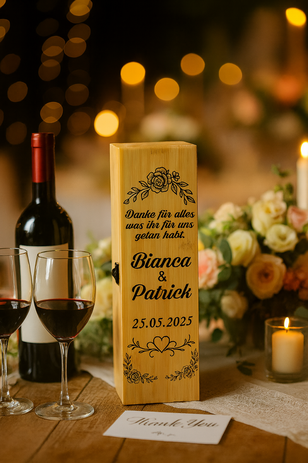 Diese edle Weinbox aus nachhaltigem Bambus ist das perfekte Hochzeitsgeschenk vom Brautpaar an die Eltern. Mit der Gravur eurer Namen, dem Hochzeitsdatum und einer persönlichen Botschaft wird sie zu einem einzigartigen Erinnerungsstück an euren großen Tag.