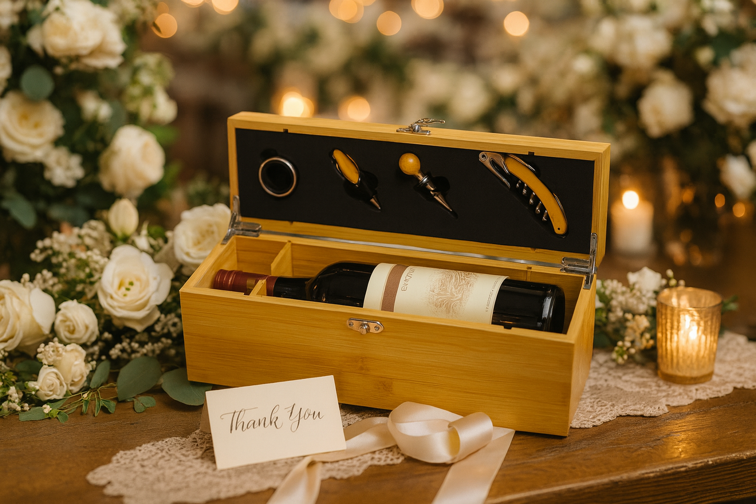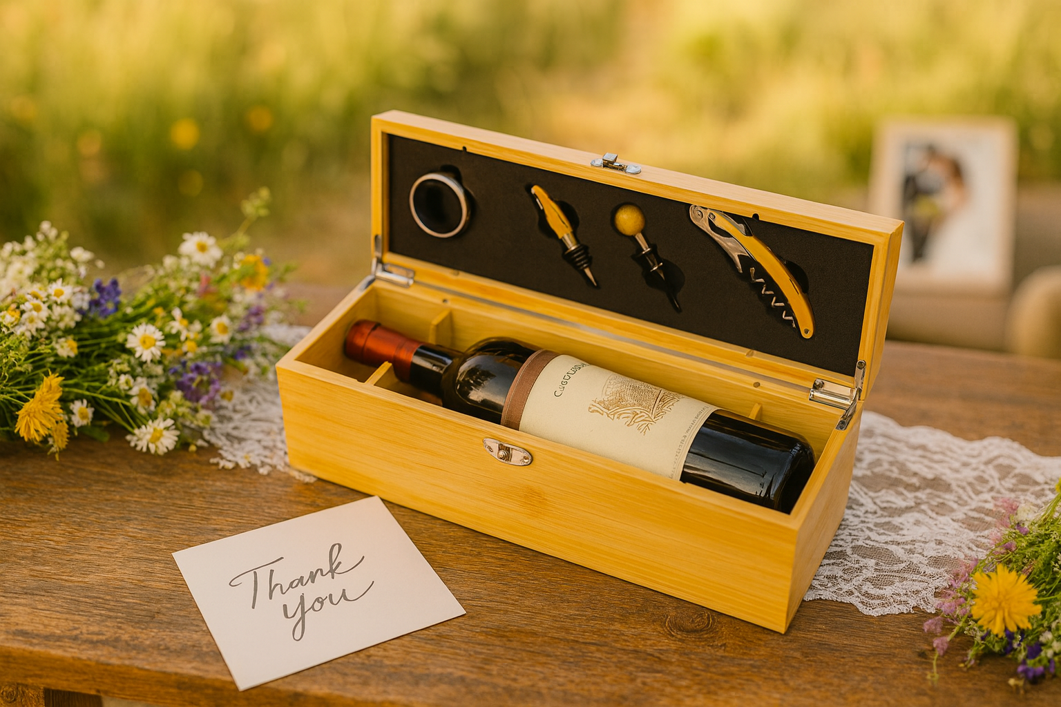 Im Inneren verbirgt sich ein komplettes Weinwerkzeug-Set – ideal für gemütliche Abende oder besondere Anlässe. Das elegante Design und die hochwertige Verarbeitung machen die Box zu einem Geschenk, das Herz und Geschmack gleichermaßen trifft.