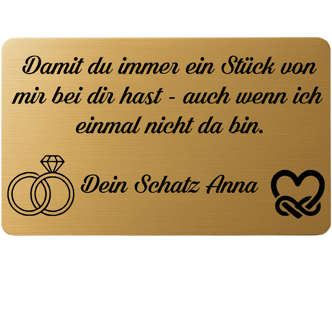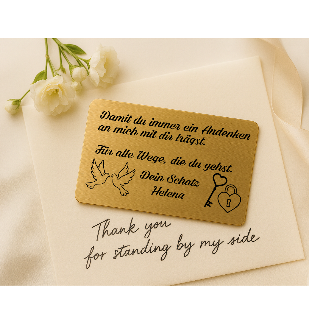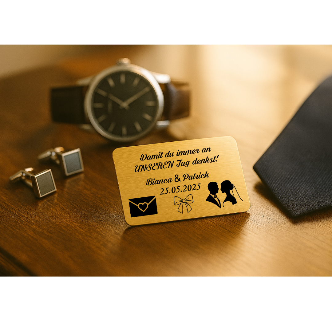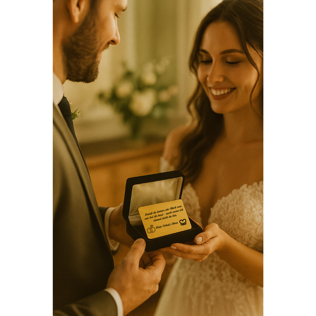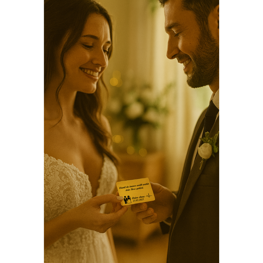 Ein stilvolles und bleibendes Erinnerungsstück, das dein Partner immer bei sich tragen kann – im Portemonnaie, in der Hochzeitsbox oder als Glücksbringer am großen Tag.