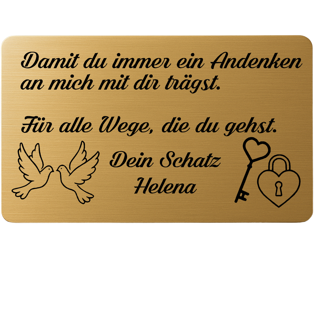 Die edle Karte wird mit modernster Lasertechnik graviert und trägt eine persönliche Widmung, z. B.
