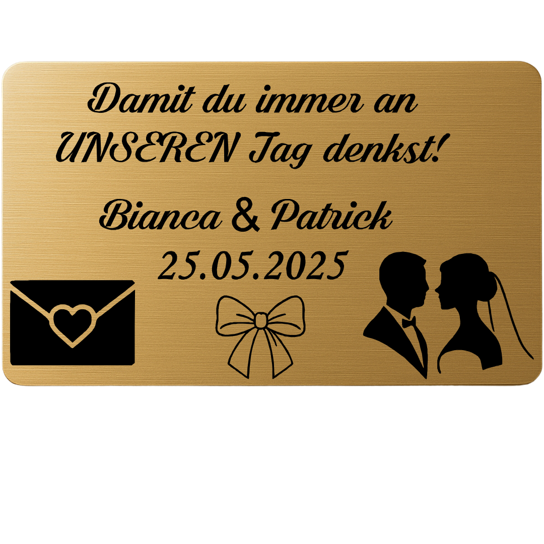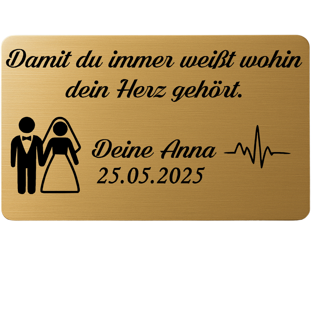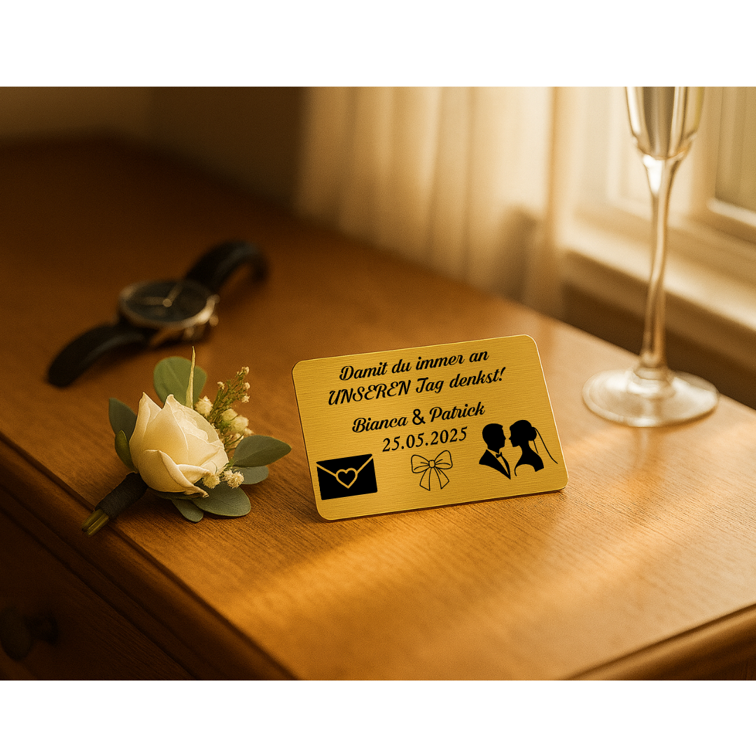 Personalisierte Edelstahlkarte mit Gravur – Geschenk von der Braut an den Bräutigam – Hochzeitsgeschenk & Andenken – Mit Namen & Datum