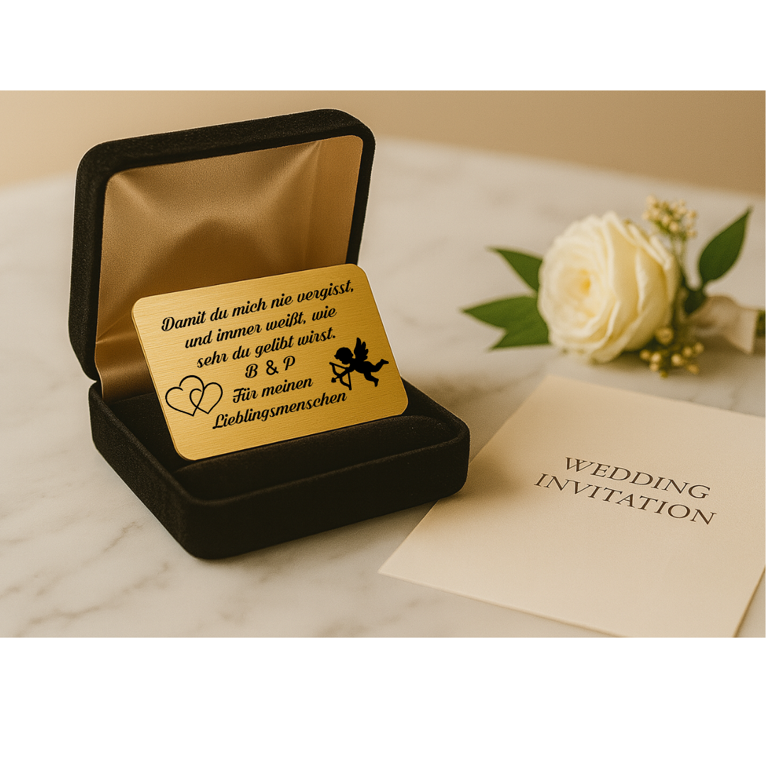Sag Ich liebe dich auf ganz besondere Weise – mit dieser eleganten Edelstahl-Geschenkkarte als liebevolle Botschaft von der Braut an ihren Bräutigam.